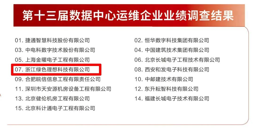 此次峰会公布了第十三数据中心工程及运维企业调查结果——“2021年度数据中心运维企业十五强”,浙江绿色理想科技有限公司再次入围,并且跻身前十,名列第七。